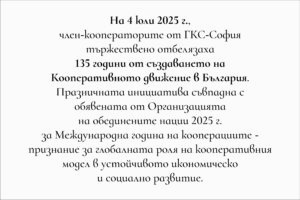 На 04.07.2025 година в Градски Кооперативен Съюз – София бе отпразнуван Международния ден на кооперациите – 05.07.2025 г., 135 години от кооперативното движение в България и обявената от ООН Международна година на кооперациите.