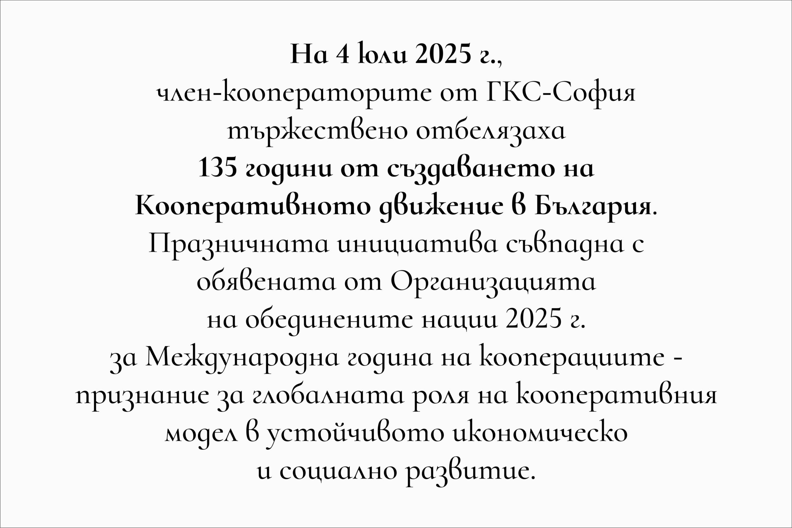 На 04.07.2025 година в Градски Кооперативен Съюз – София бе отпразнуван Международния ден на кооперациите – 05.07.2025 г., 135 години от кооперативното движение в България и обявената от ООН Международна година на кооперациите.